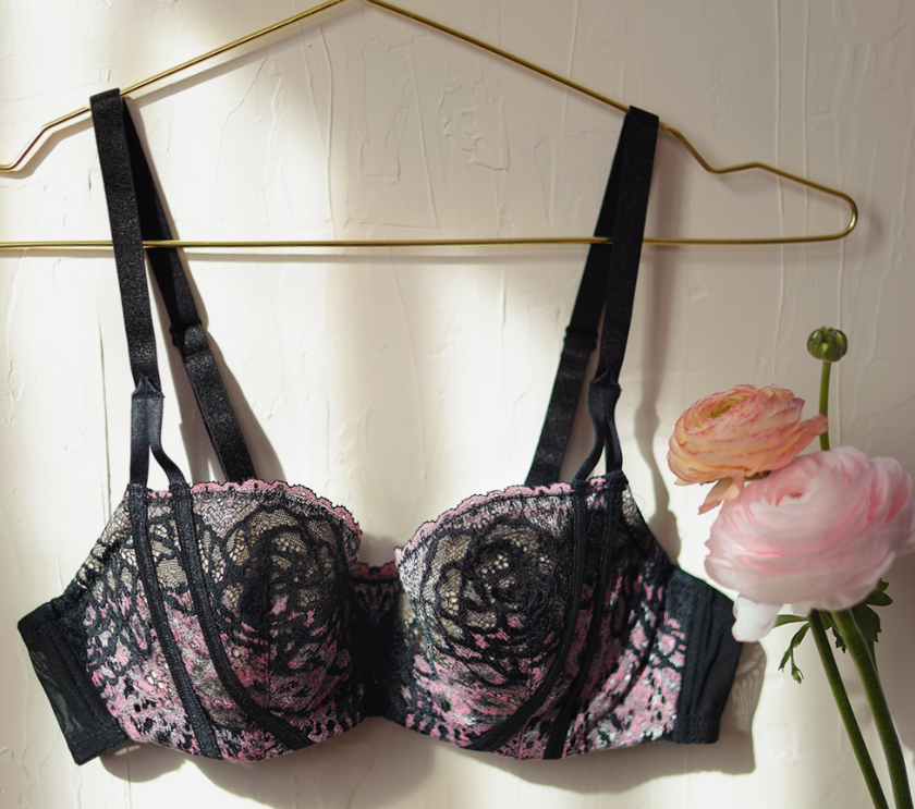 Corbeille coupe qui découvre joliment le haut de la poitrine tout en offrant un bon maintien. Dentelle noire délicate aux motifs floraux, superposé sur un fond rose légèrement satiné. Joli contraste visuel entre la transparence de la dentelle et le fond. deux bandes verticales noires structurent le bonnet apportant à la fois du maintien et une touche graphique,